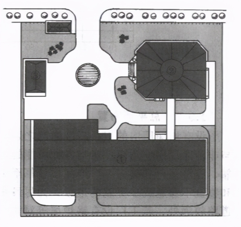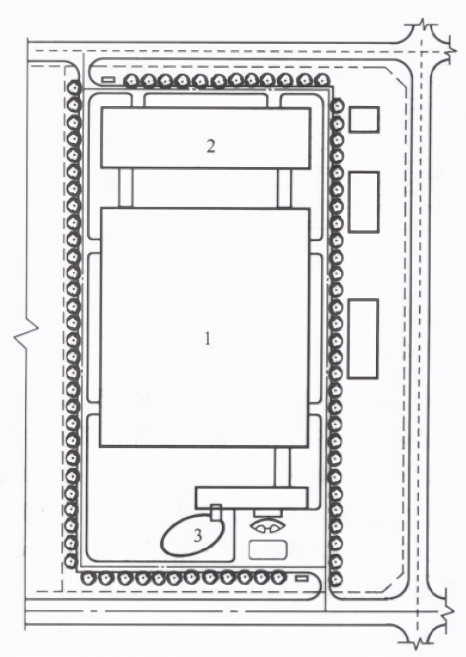 设有洁净室的厂房内,通常可分为洁净室(区)、洁净室辅助用房、公用动力用房、办公管理用房等,为了方便管理,减少厂区各种动力管线长度,尽量降低对洁净室的污染程度,在规范、标准规定允许的前提下,现今各类设有洁净厂房的工厂在进行工厂总平面布置时,尽量按组合式、大体量的综合性厂房进行布置,可将多个有洁净要求的车间及洁净室辅助用房、办公管理用房以及部分或全部公用动力设施集中布置在一栋综合性厂房内,下图是某电子工厂的总平面布置方案,它由生产厂房、动力设施用房和办公管理用房组成,生产厂房与大部分动力公用设施均设在一幢组合厂房内,既方便管理,又可节约能耗。