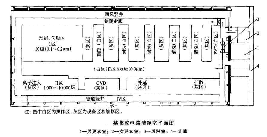 根据不同产品的制造工序,合理确定各种空气洁净度等级分区规划;若有不同的压差要求时,还应按不同生产房间的压差要求确定洁净分区规划。下图是一个集成电路生产用无尘生产车间的平面实例