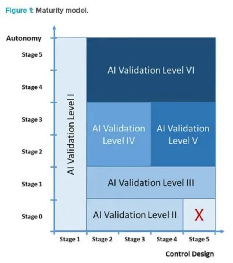 为了应对上述挑战,ISPED/A/CH(德国、奥地利和瑞士)AI验证附属工作组定义了一个行业特定的AI成熟度模型。该模型基于控制设计和自主性两个维度,将AI系统的成熟度分为六个级别。每个级别都代表了AI系统在接管保护产品质量和患者安全方面的不同能力。
